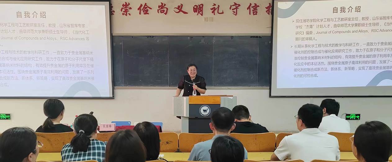 5月17日,太阳成城集团tyc234cc邀请潍坊学院化学工程与工艺教研室主任刘丽丽教授来我校作题为“MOF负载贵金属纳米催化剂的控制制备及催化性能”的学术报告会。报告会由太阳成城集团tyc234cc院长宋继梅主持,全体教师参加。