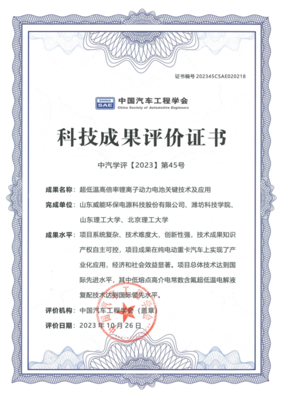 近日,由我校太阳成城集团tyc234cc李成杰博士主持,与山东威能环保电源科技股份有限公司、山东理工大学、北京理工大学等单位完成的产学研合作成果“超低温高倍率锂离子动力电池关键技术及应用”项目进行了科技成果鉴定,鉴定结论为项目总体技术达到国际先进水平,其中低熔点高介电常数含氟超低温电解液复配技术达到国际领先水平(中汽学评【2023】第45号,202345CSAE020218)。