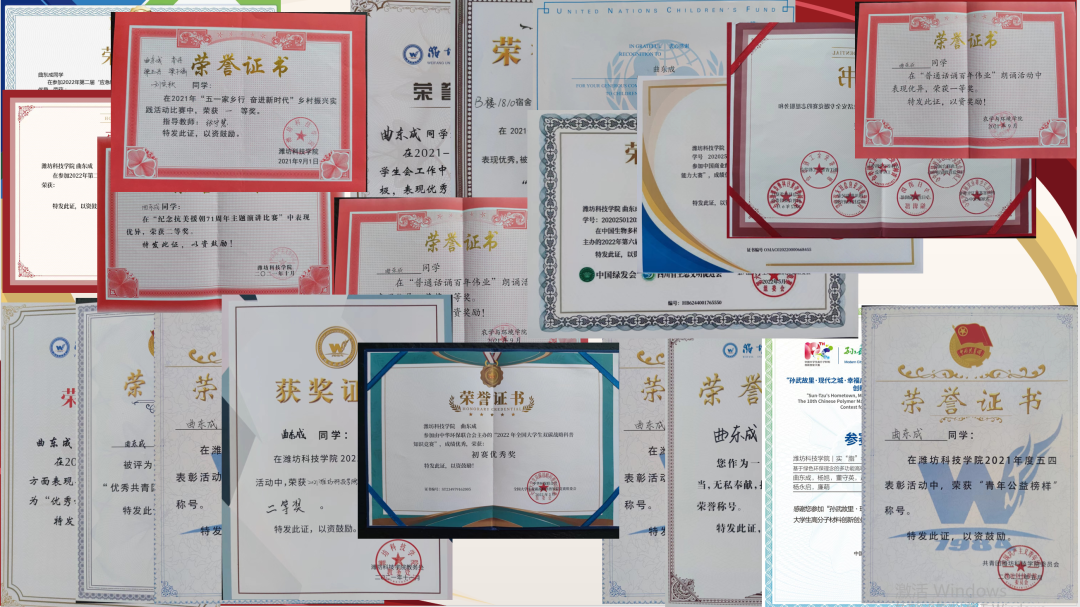 在学习上,曲东成勤奋踏实,注重技能培养。他明白学习是学生的头等大事,只有学好文化知识,积累丰富的理论知识,才能为将来成为一名优秀的专业人才打下坚实的基础。只有学习才能获得广博的知识和过人的智慧,以此来应对无常的人生。也只有学习,才能使他的整个大学生涯感到充实。所以他上课认真听讲,做好笔记,不懂就问。当同学们还在睡觉时他就已经起来早读了,当他人在宿舍玩电脑时,他在自习室到很晚才回去。当然,仅仅学好专业课知识还不能符合社会对大学生的要求。于是他利用课外时间广泛涉猎其他科学知识。他要珍惜每分每秒去提高自己,充实自己,完善自己。只有这样他才能不辜负父母的嘱托,老师的期望。虽然视力的受限给曲东成的生活学习带来了一定的困难,但是他从不气馁,学习效率不如别人,他就拿出更多的时间来弥补,能力基础不如别人,他就用努力来填平差距。在他的勤奋努力下,在过去的一年里,他的学习成绩位列专业第七,综合测评成绩位列专业第二。今年上半年,他也参加了很多专业竞赛的项目。在今年上半年,他参加了“微瑞杯”第三届“全国大学生化学实验创新设计大赛”,作为队伍的主答辩人,带领团队获得华北赛区一等奖和全国总决赛二等奖。在第三届“全国大学生生命科学竞赛(2022.创新创业类)”中,他们的项目同样获得了全国二等奖;在第九届“PMC 全国大学生高分子材料创新创业大赛”中,他们的项目已进入全国总决赛,将来将向着更好的成绩发起冲击。除此之外,在十一届“山东省大学生化工过程创新设计大赛”和“山东省大学生高分子材料创新设计大赛”中,他们的项目也进入了复赛的评比,在不久的将来也会向更好的成绩发起冲击。除了这些专业类型的竞赛,学校和院系举办的活动他也积极参与,多次参加学校举办的演讲、朗诵、学科竞赛、专业知识竞赛、专业技能竞赛、学科调研竞赛,均有优秀的表现和奖项的收获。他也曾多次被评选为太阳成集团tyc234cc“优秀共青团员”、“优秀学生会干事”、“优秀志愿者”、“先进个人”、“优秀学生”“青年公益榜样”等荣誉称号。在第二届“应急科普华夏行”大学生生活安全竞赛,大学生网络安全竞赛中积极展现和宣传,被组委会评定为“优秀宣传大使”。在学术方面也有自己的突破,参与《水稻秸秆制备抗紫外线液体地膜的研究》论文的发表,也参与到两项国家专利的申请工作中。